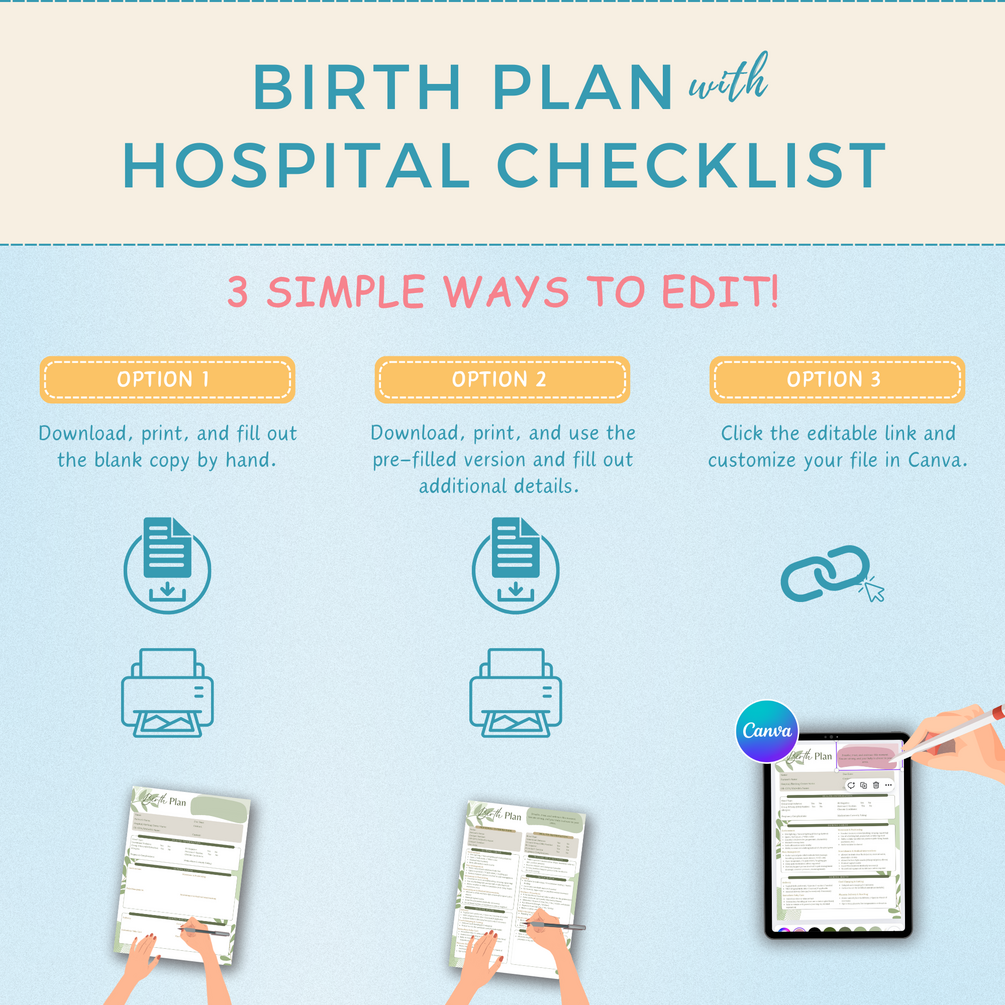 • Editable Birth Plan & Hospital Checklist: Choose from pre-filled or blank versions, with options for a 1-page or 2-page layout.